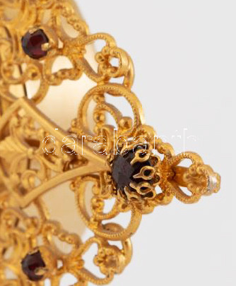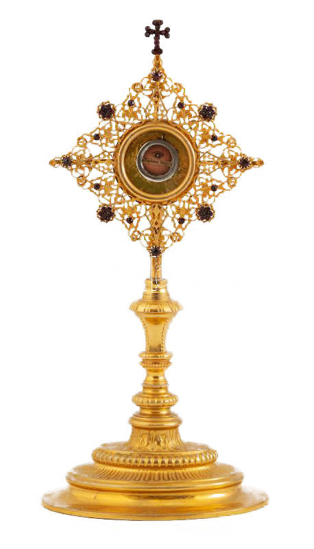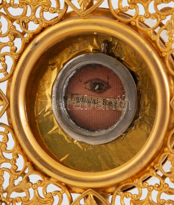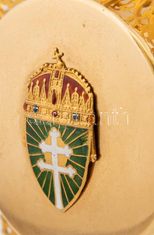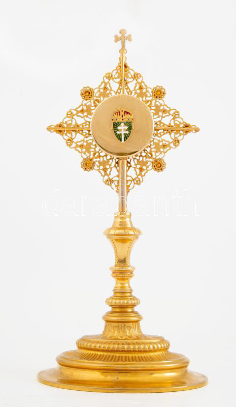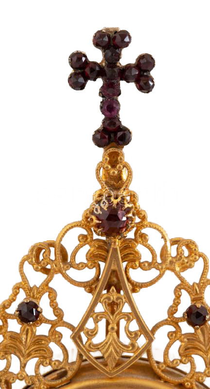 XVIII. sz. Szent László (cca 1040-1095) magyar király csontereklyéje: XX. századi részben ezüstözött réz ereklyetartó kapszulában (30x30 mm.) A kapszulát Basilio Pompilj (1858-1931) bíboros, Róma vicarius generalisa hitelesítő viaszpecsétje zárja, hitelesítési sorszámmal (278/1927), a pecsét és a záró zsinórok épek, biztosítják az ereklye integritását. Az ereklyetartó kapszula XX.-ik századi, aranyozott, gránátokkal ékített fém ereklyetartóban. Az ereklyetartón tűzzománcozott kettőskereszt címerpajzs szentkoronával, talpán rézmetszővel szép talpmetszet (330x165 mm.) / Reliquary of Hungarian King Saint Ladislaus (Approx. 1040-1095) Presented for auction is an 18th-century reliquary containing relics of Saint Ladislaus, the revered Hungarian king. This historical piece is encapsulated within a 20th-century partially silver-plated copper reliquary capsule, measuring 30x30 mm. The reliquary capsule is sealed with the wax seal of Basilio Pompilj (1858-1931), Cardinal and Vicar General of Rome, bearing the authentication serial number "278/1927." The seal and closing cords remain intact, assuring the integrity of the relic. Reliquary Housing: The reliquary capsule is housed within a 20th-century gold-plated metal reliquary, adorned with garnets for added elegance. Note that one garnet has been replaced with a glass gem. The reliquary proudly displays a cloisonné enamel double-cross emblem with a sacred crown, measuring 330x165 mm.
