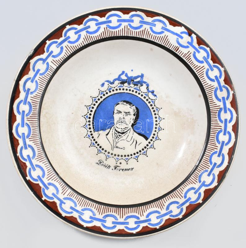 Description: Nowotny Altrohlau manufaktúra: Deák Ferencz falitányér. Cca 19. sz. vége, fajansz, masszába nyomott jelzéssel, mázrepedéssel, repedésvonallal, d: 23,5 cm