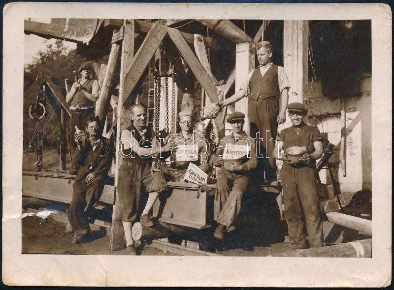 cca 1920 Múcsony, Alberttelep, szénbánya bányászokkal, kezükben az alberttelepi bánya termékeit hirdető papírlapok, fotó szakadással, 6,5×89 cm