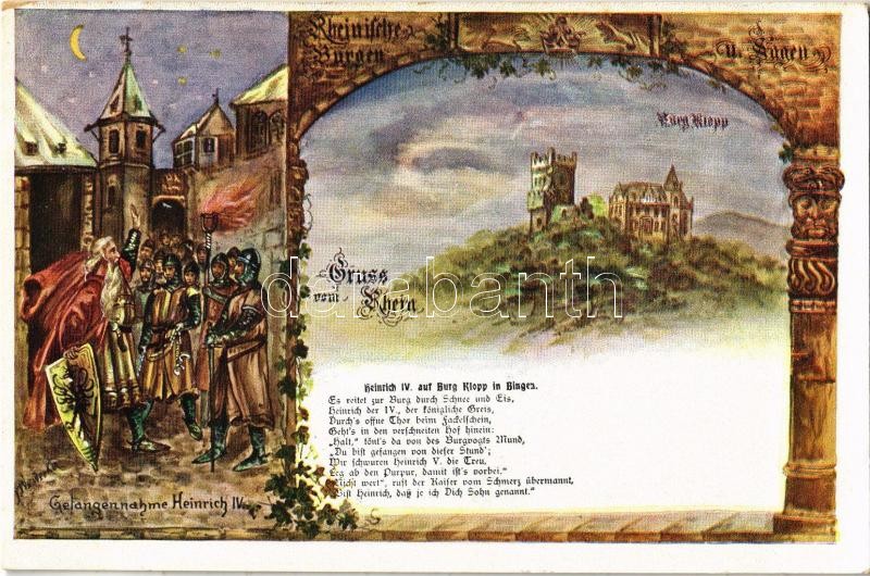 Bingen am Rhein, Burg Klopp, Gelangenahme Heinrich IV; Rheinische Burgen und Sagen, Josef Wewerka / German emperor with soldiers, castle s: Wewerka