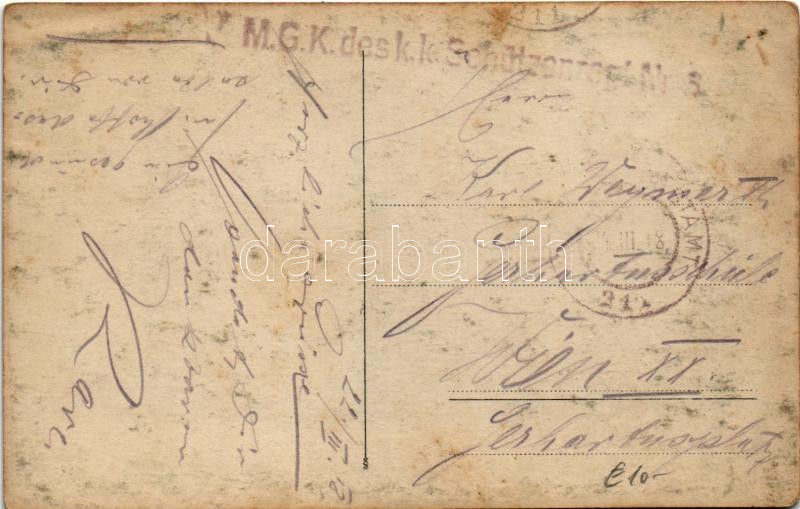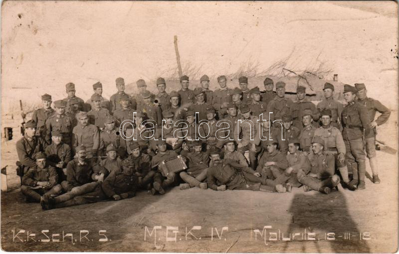1918 K.K. Sch. R. S. M.G.K. IV. Malurile / WWI Austro-Hungarian K.u.K. military, group of soldiers. photo + "M.G.K. des k.k. Schützenregt. Nr. 6." (lyuk / pinhole)