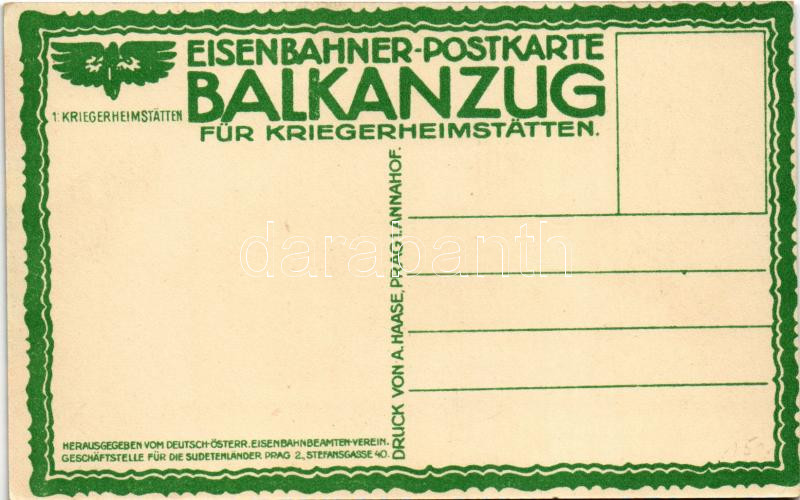 Eisenbahner-Postkarte Balkanzug für Kriegerheimstätten. Druck von A. H... https://www.darabanth.com/en/430-Online-auction/430.0/Postcards/Militaria~1500063/Eisenbahner-Postkarte-Balkanzug-fur-Kriegerheimstatten-Druck-von-A-Haase-Prag-WWI-Austro-Hung~II2757726