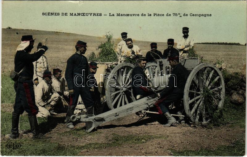 Scenes de Manoeuvres. La Manoeuvre de la Piece de 75 de Campagne / WWI French military, artillery (kis szakadás / small tear)