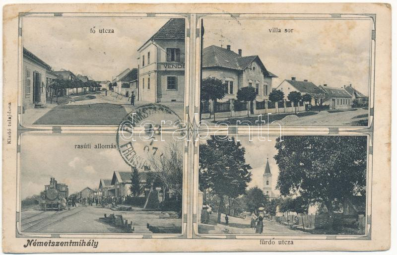 1907 Nagyszentmihály, Németszentmihály, Grosspetersdorf; Fő utca, vendéglő, villa sor, vasútállomás, gőzmozdony, vonat, Fürdő utca, templom / main street, restaurant, villa, railway station, locomotive, train, street view, church + "PINKAFŐ - SZOMBATHELY 145. SZ." vasúti mozgóposta bélyegző (fl)