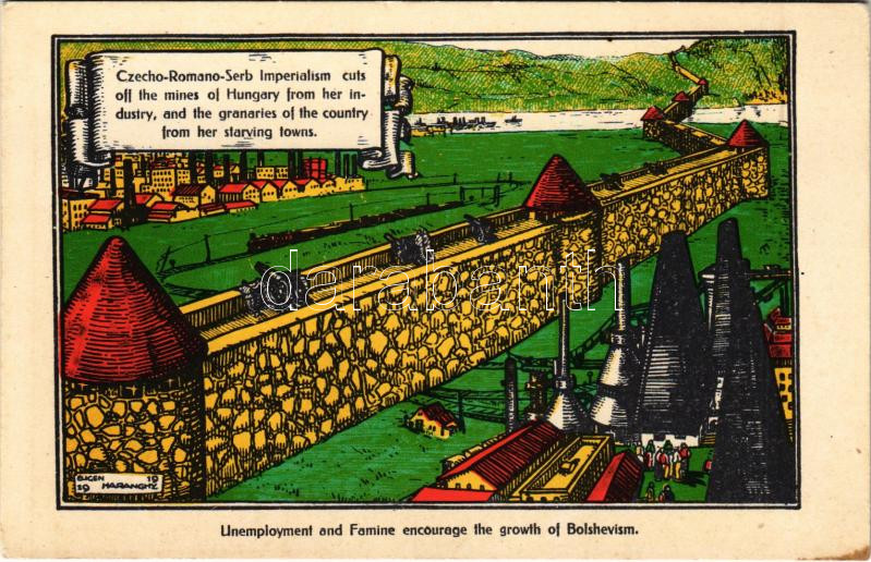Description: A cseh-román-szerb imperializmus Magyarországon elvágja a bányát a nagyipartól, az éléskamrát az éhező városoktól! A munkanélküliség és az éhség tenyészti a bolsevizmust! / Anti-Czecho-Romano-Serb Bolshevism propaganda card. Unemployment and Famine encourage the growth of Bolshevism. Hungarian irredenta s: Eugen Haranghy