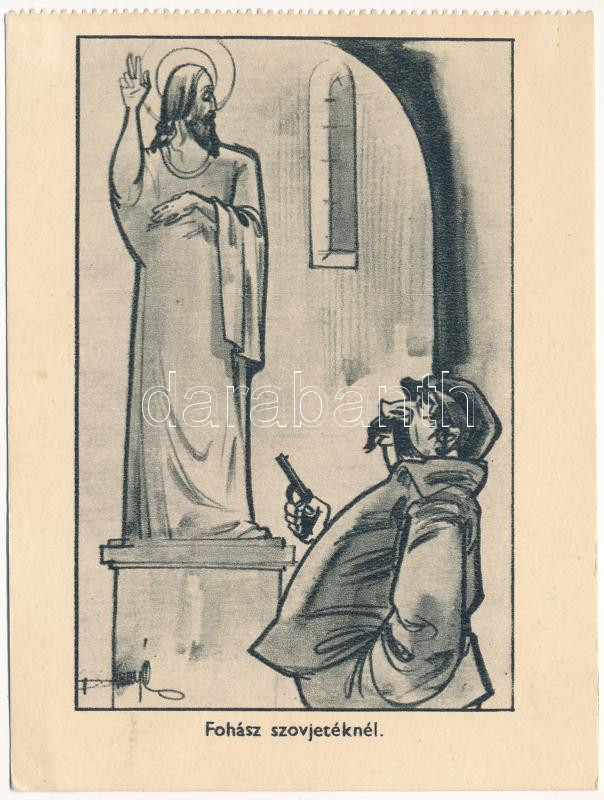 Fohász szovjeteknél. 1919. Júniusi Bajtársak Szövetsége anti-bolsevista levelezőlap-sorozata. Terjeszti a Propaganda Iroda / Hungarian anti-Bolshevik, anti-Soviet propaganda s: Dinnyés (EK)