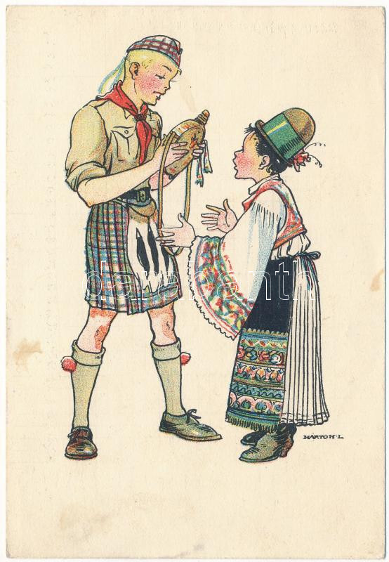 Magyar legény ajándékot ad a skót cserkésznek. Magyar Cserkészszövetség kiadása / Hungarian scout art postcard with Scottish scout s: Márton L. (EK)