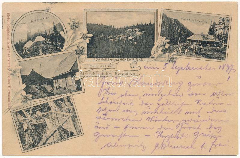 1897 (Vorläufer!) Grüss aus den Siebenbürgischen Karpathen! Negoi-Schutzhütten, Kurhaus auf der Hohen Rinne (Paltinis), Bullea-Schutzhütte, Presbe-Schutz, Drachensteig. Siebenbürgischer Karpathenverein Section Hermannstadt / Üdvözlet az Erdélyi Kárpátokból! Szebenjuharos, Negoj, Bólya menedékházak, gyógyházak. Az Erdélyi (Szász) Kárpát Egyesület Nagyszebeni részlegének kiadása / spa, rest houses, mountain huts in the Transylvanian Carpathians. Art Nouveau, Floral (EK)