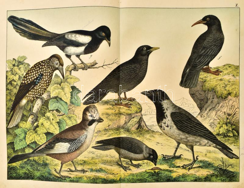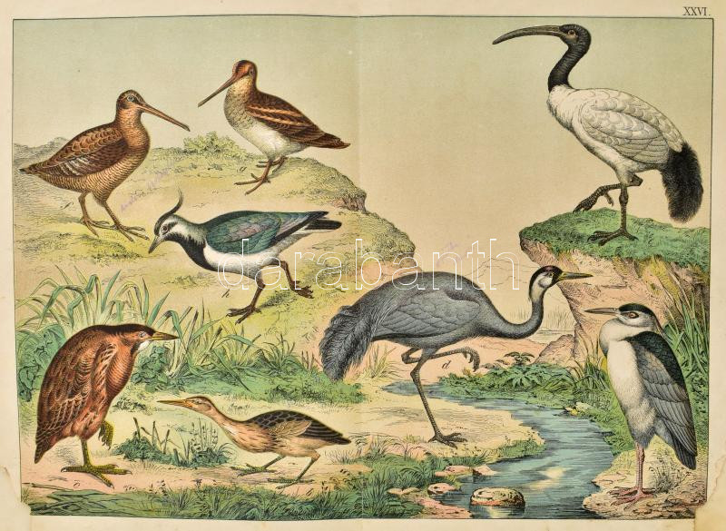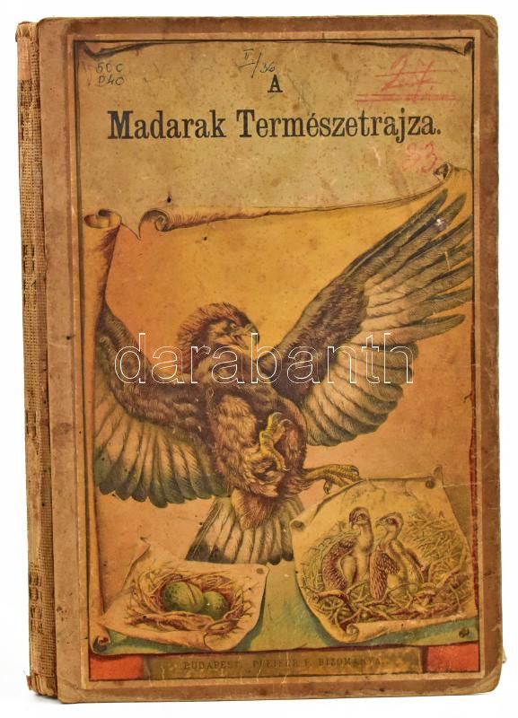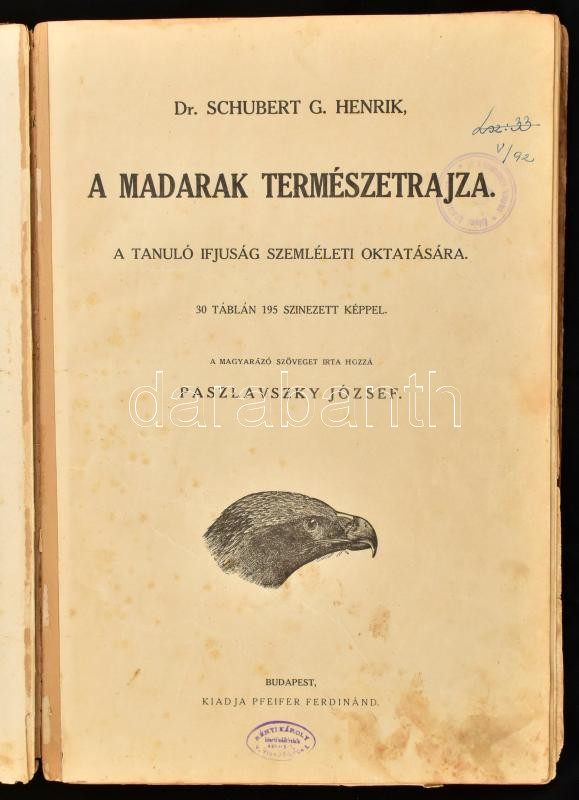 [Schubert, Gotthilf Heinrich von] Dr. Schubert G. Henrik: A madarak természetrajza. A tanuló ifjuság szemléleti oktatására. (30 táblán 195 színezett képpel). A magyarázó szöveget írta: Paszlavzsky József. Bp., é.n. (cca 1880), Pfeifer Ferdinánd, 15+(2) p. + 8 (színes, litografált) t. Kiadói viseltes félvászon-kötés, hiányos gerinccel, helyenként sérült, foltos lapokkal, a képtáblák sérültek, hiányosak.