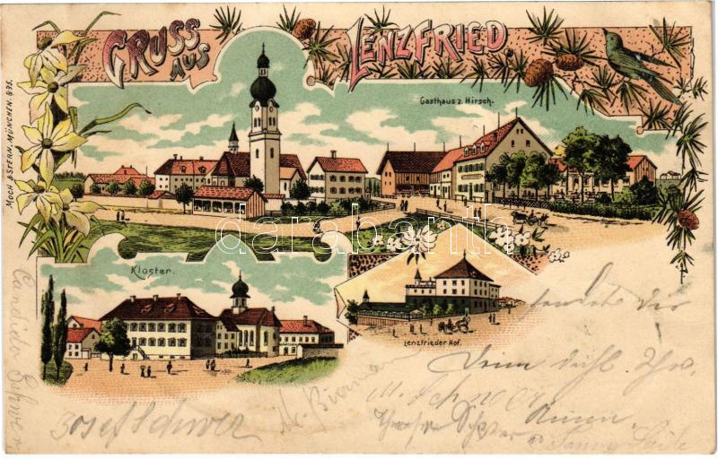1898 (Vorläufer) Lenzfried (Kempten), Gasthaus z. Hirsch, Kloster, Lenzfrieder Hof / inn, monastery, castle. Art Nouveau, floral ,litho (r)