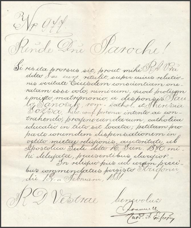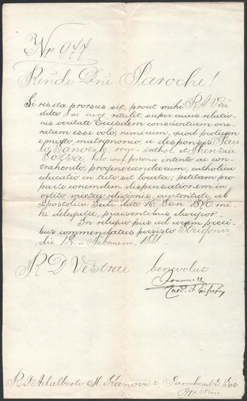 1881 Simor János bíboros, esztergomi érsek által aláírt hivatalos irat