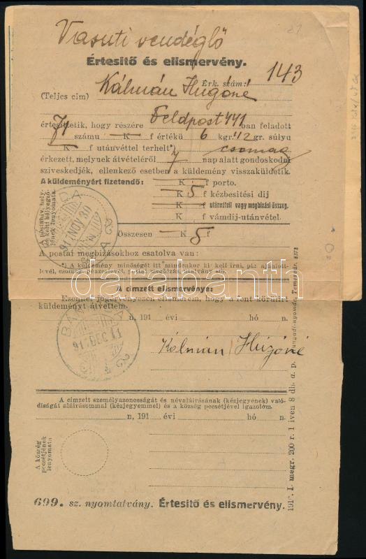 1917 10f díjjegyes csomagszállító K.u.K. Feldpost 2K bérmentesítéssel ... https://www.darabanth.com/en/45-Major-auction/45.1/Hungarian-philately-and-postal-history-Online/Austro-Hungarian-fieldpost-WWI-Naval-force~18750/1917-10f-dijjegyes-csomagszallito-KuK-Feldpost-2K-bermentesitessel-Banhidara-kuldve-A-tartalom~II3436236