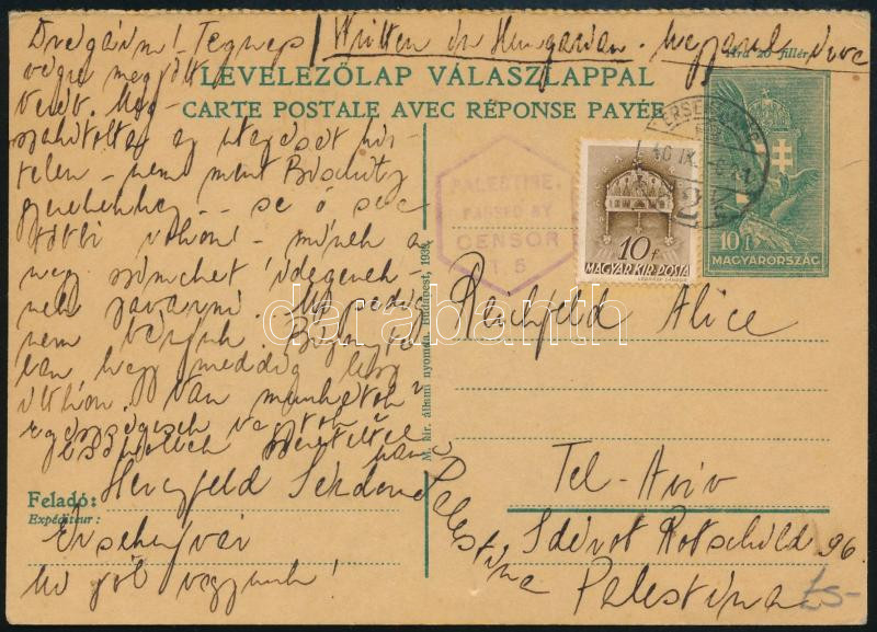 1940 10f díjjegyes, díjkiegészített levelezőlap Palesztínába küldve, ott cenzúrázva / PS-cover with additional franking to Palestine with censure