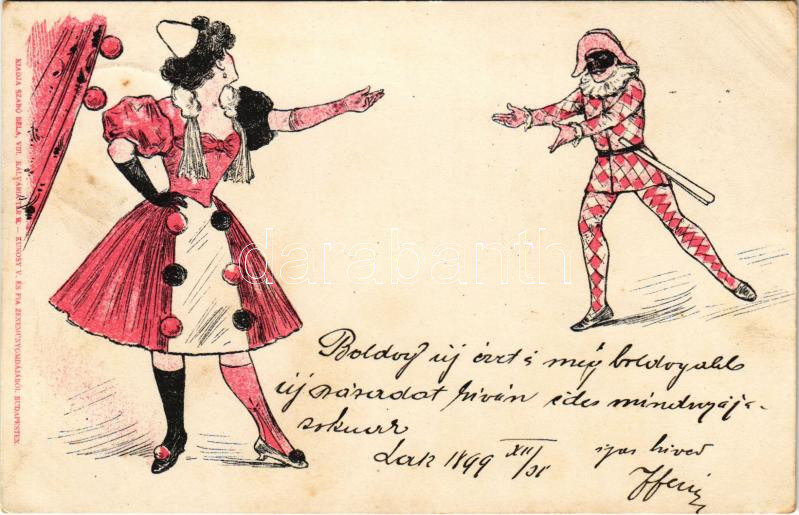 1899 (Vorläufer) Bohóc szerelem. Kiadja Szabó Béla, Kunosy V. és fia zenenyomdájából / Clown love, greeting card (EK)