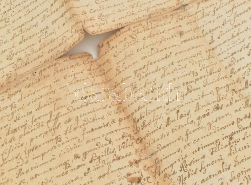 1754 VI Károly császár, III. Károly néven magyar király oklevelének korabeli másolata Hoffer Mátyásnak felvidéki nemesek Mésházy Miklós, Csáky Zsigmond, Somogyi Ferenc említésével Pozsonyban hitelesítve. Sérült, szakadt 73x50 cm / 1754 Emperor Charles VI, A copy of the certificate of the Hungarian king under the name of Károly, Mátyás Hoffer, authenticated in Bratislava with the mention of highland nobles Miklós Mésházy, Zsigmond Csáky, and Ferenc Somogyi. Damaged, torn 73x50 cm