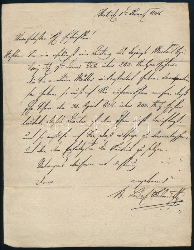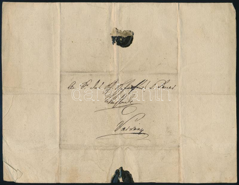 1838 Német nyelven írt, hivatalos/üzleti témájú levél, egy beírt oldal, B. Laubál aláírással, Varsányba küldve, sérült viaszpecséttel