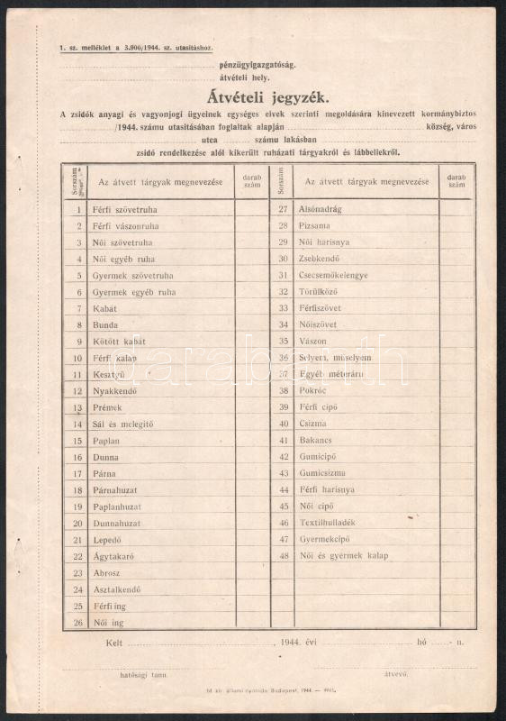 https://www.darabanth.com/en/460-Online-auction/460.0/Art-and-other-collectibles/Judaica~1000008/1944-Atveteli-jegyzek-zsido-vagyon-lefoglalasahoz-kitoltetlen~II3084200