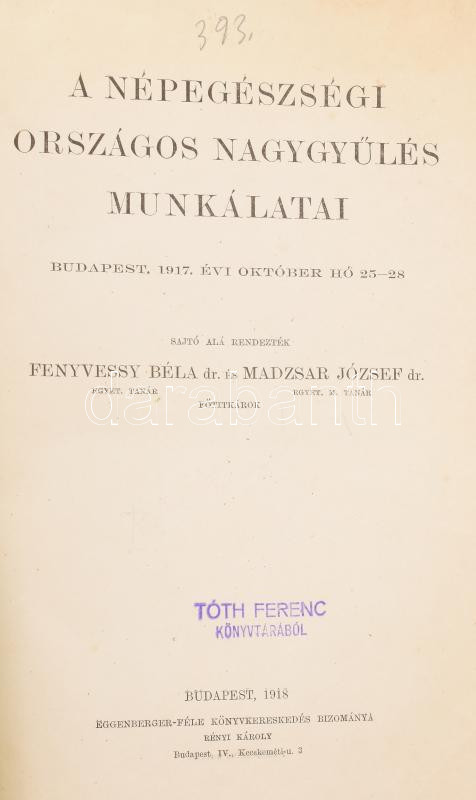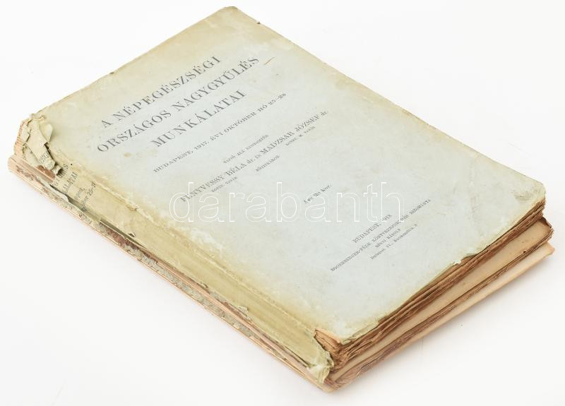 A Népegészségi Országos Nagygyűlés munkálatai. Budapest, 1917. évi október hó 25-28. Sajtó alá rendezték: Fenyvessy Béla és Madzsar József. Bp., 1918, Eggenberger-féle könyvkereskedés (Franklin-ny.), VIII+557 p. Egyetlen kiadás. Kiadói papírkötés, sérült, széteső állapotban, a könyvtest több részre vált, a hátsó borító hiányzik. Ritka!