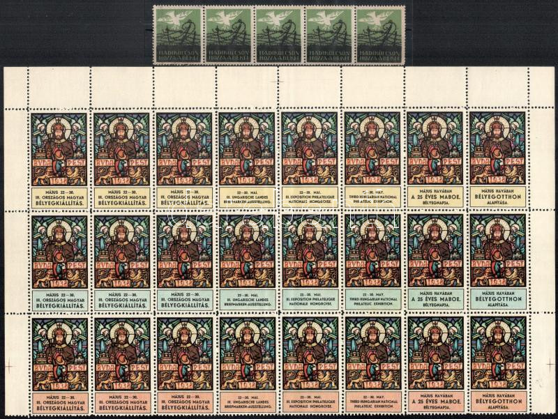 1938 III. Országos Magyar Bélyegkiállítás hajtott 24-es ívdarabban + Hadikölcsön levélzáró 5-ös csík