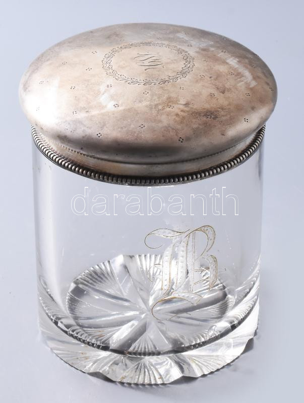 1897 Ezüst (Ag) fedeles kekszes üveg. Csiszolt kristály üveg B betűvel... https://www.darabanth.com/en/462-Online-auction/462.0/Jewellery-and-precious-metal-items/Jewellery-and-precious-metal-items~2000049/1897-Ezust-Ag-fedeles-kekszes-uveg-Csiszolt-kristaly-uveg-B-betuvel-Jelzett-ezust-fedellel-~II3110574
