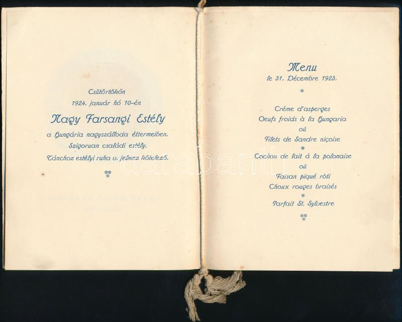 1923 Grand Hotel Hungária Budapest szilveszteri menükártya, zsinórfűzö...