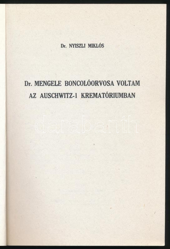 Dr. Nyiszli Miklós: Dr. Mengele boncolóorvosa voltam az Auschwitz-i kr... https://www.darabanth.com/en/468-Online-auction/468.0/Books/Books-Judaica~1500037/Dr-Nyiszli-Miklos-Dr-Mengele-boncoloorvosa-voltam-az-Auschwitz-i-krematoriumban-Hn-en-~II3164594