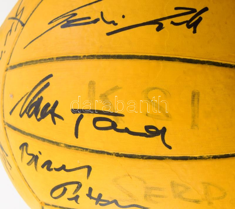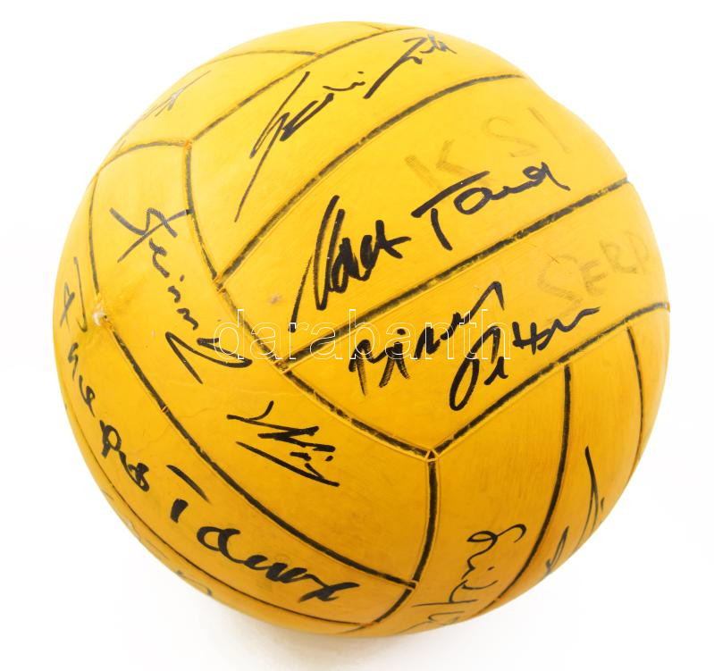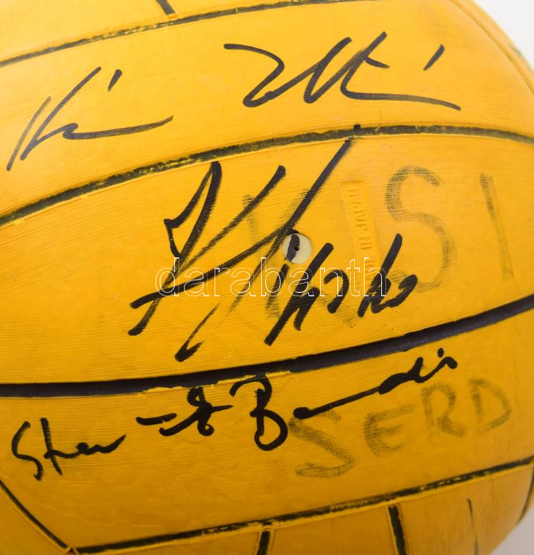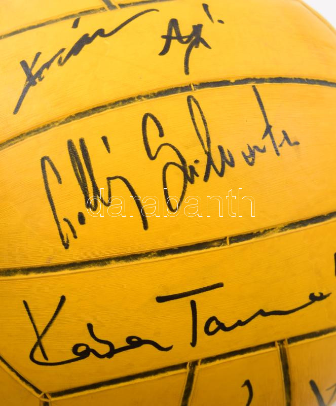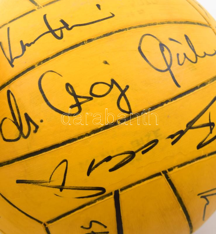 Vízilabda gálamérkőzésem magyar vizalabdázók, olimpiai és világbajnok sportolók által aláírt vízilabda: Benedek Tibor, Biros Péter, Dr., Molnár Tamás, Székely Bulcsú, Kócz Zoltán, Stemecz Barnabás, Kovács KOKO István, Kovács Agi, Kásás Tamás, Csollány Szilveszter, Stermecz Ádám, Faragó Tamnás, dr. Csapó Gábor és még mások. cca 2000. Hálóval.