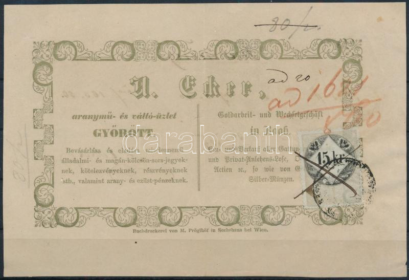 1859 Győr, A. Ecker aranymű- és váltó-üzlet kétnyelvű reklámlapja, 15kr okmánybélyeggel, hátoldalán kézzel írt nyugta(?)