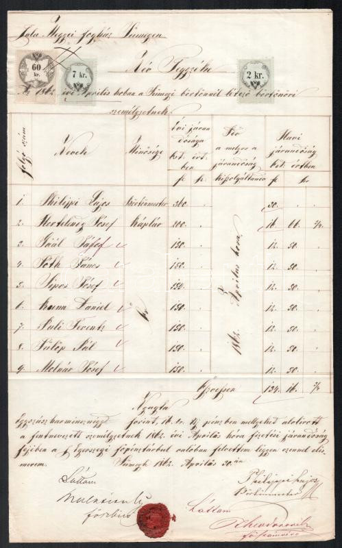 Description: 1862 Sümeg, a Zala megyei fogház börtönőri személyzetének névjegyzéke, a nevek mellett évi és havi járandóságok (fizetések) listájával; főszolgabírói, börtönmesteri és főszámvevői aláírásokkal, 60+7+2kr okmánybélyeggel, viaszpecséttel