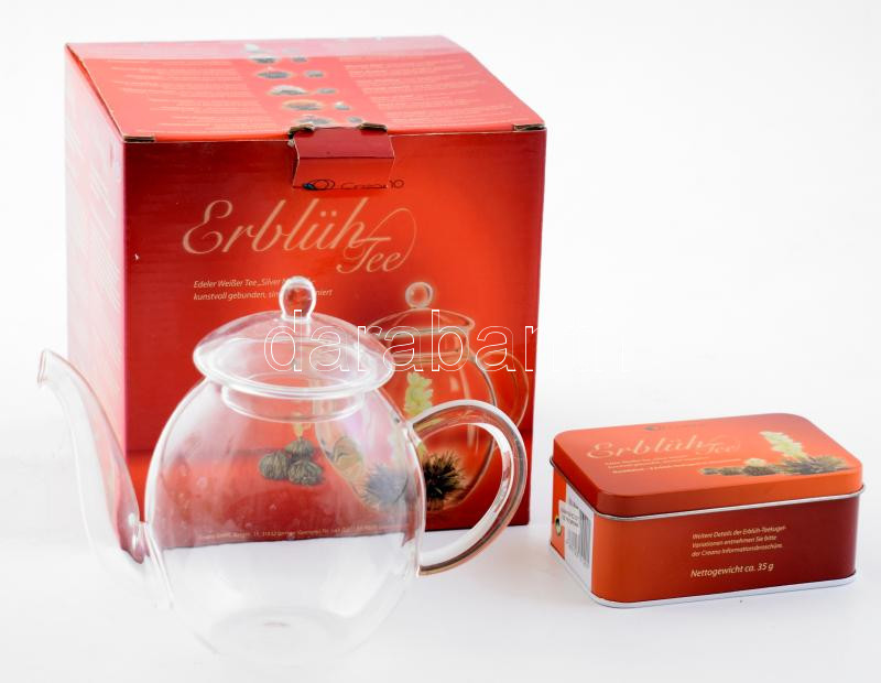 Teás készlet, kanna, hozzá művészien preparált fehér tea eredeti doboz...
