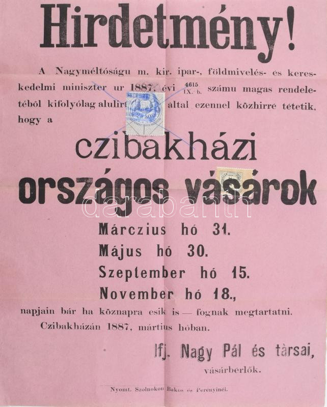 1887 Cibakháza országos vásár plakát. 2,5ft illetékbélyeggel 31x41 cm