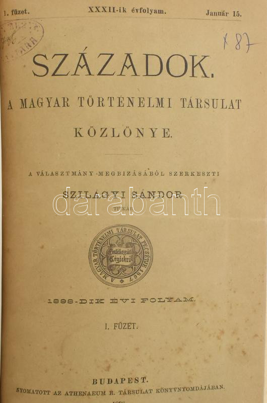 1898 Századok. A Magyar Történelmi Társulat közlönye. Szerk.: Szilágyi... https://www.darabanth.com/en/478-Online-auction/478.0/Books/Books-History~2000028/1898-Szazadok-A-Magyar-Tortenelmi-Tarsulat-kozlonye-Szerk-Szilagyi-Sandor-XXXII-evf-1-10~II3219123