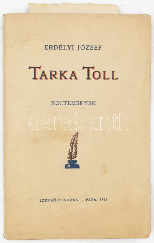 Költemények. Pápa, 1931, Szerző. (Főiskol... https://www.darabanth.com/en/478-Online-auction/478.0/Books/Books-Other-rarities~298/Erdelyi-Jozsef-Tarka-tollKoltemenyek-Papa-1931-Szerzo-Foiskolai-ny-29-l-1-sztl-lev-200~II3240049