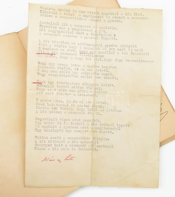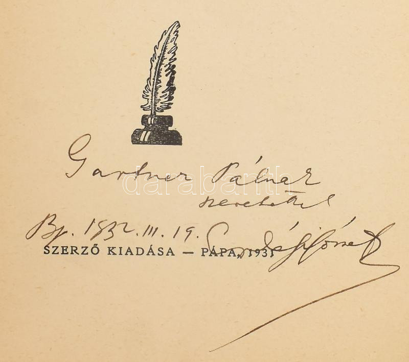 Költemények. Pápa, 1931, Szerző. (Főiskolai ny.) 29 l. 1 sztl. lev. 200 mm. Első kiadás. DEDIKÁLT példány! Fűzve, kiadói borítóban, szép állapotban. A költő egyik ritka verseskötete. Hozzá a költő egy gépelt verskézirata javításokkal
