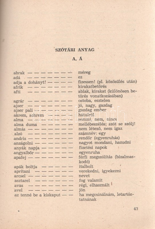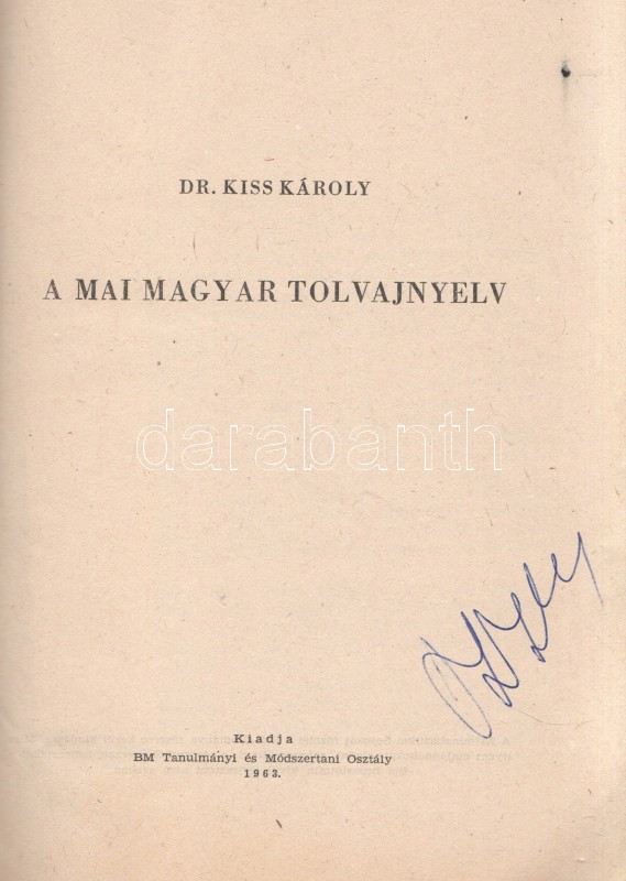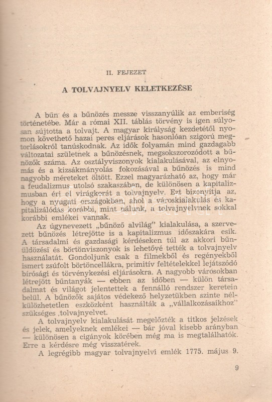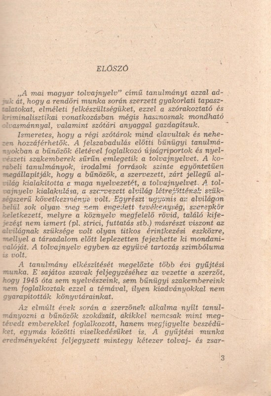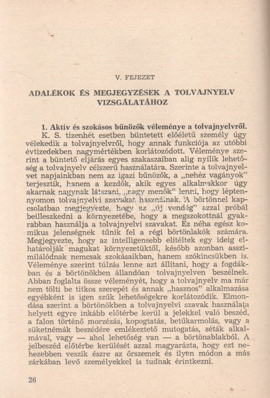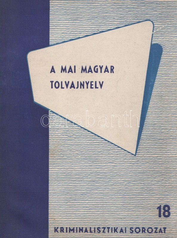 Kiss Károly: A mai magyar tolvajnyelv. (Budapest), 1963. BM Tanulmányi és Módszertani Osztály (Zrínyi Nyomda). 92 + [4] p. Egyetlen kiadás. Belső terjesztésű kiadvány: ,,A Kriminalisztikai Sorozat füzetei a BM állománya részére kerül kiadásra. Mint ilyent elajándékozni, eladni, sokszorosítani, e sorozatból szerzett ismereteket a BM beosztottjain kívül terjeszteni nem szabad". A szótárrész előtt alapos bevezető, melyben az összeállító megindokolja a mű összeállítását (a korábbi tolvajszótárak elavultak), illetve kijelenti, hogy a szótár nem nyelvészeti, hanem bűnüldözési célból készült. A bevezető erős állítása szerint az itt feltérképezett tolvajnyelv használata általánosságban is visszaszorulóban van, és inkább a bűnözői körökbe belépők nyelvhasználatára jellemző, mint a bűnöző körök régi tagjaira. A részletes szótári rész emlékezetes látószöget nyit a tolvajvilág módszertanára, nő-, munka-, rendőr- és társadalomszemléletére. (Kriminalisztikai sorozat, 18. füzet.) Fűzve, kiadói borítóban. Jó példány.