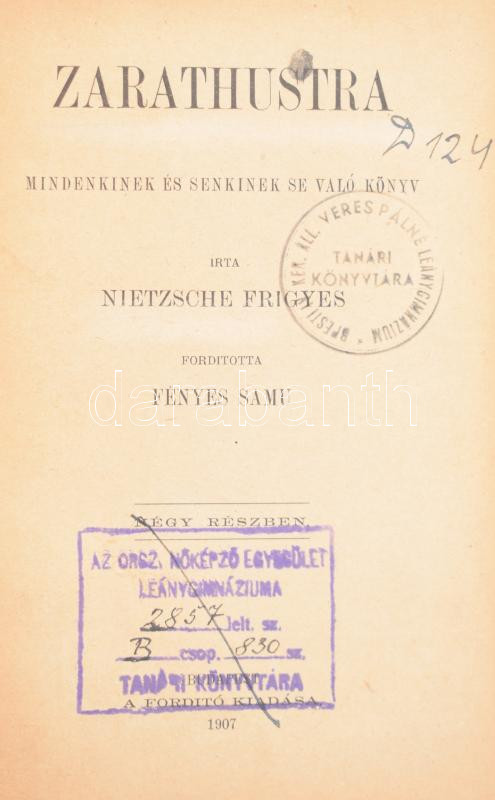 Nietzsche Frigyes: Zarathustra. Mindenkinek és senkinek se való könyv.... https://www.darabanth.com/en/478-Online-auction/478.0/Books/Books-Social-sciences~309/Nietzsche-Frigyes-Zarathustra-Mindenkinek-es-senkinek-se-valo-konyv-Bp-1907-Fordito~II3262754