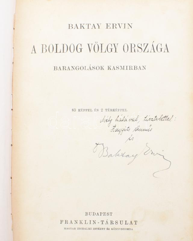 Baktay Ervin (1890-1963): A boldog völgy országa. Barangolások Kasmirban. A szerző, Baktay Ervin (1890-1963) orientalista, író, szerkesztő, India-kutató és India-utazó és Hagyits Anna (?) által DEDIKÁLT példány! A Magyar Földrajzi Társaság Könyvtára. Bp., [1934], Franklin-Társulat, 1 t.+ 220+(2) p.+ 28 (kétoldalas fekete-fehér képtáblák) t.+ 2 térkép. Kiadói aranyozott egészvászon sorozatkötésben, kopott borítóval és gerinccel, laza kötéssel.