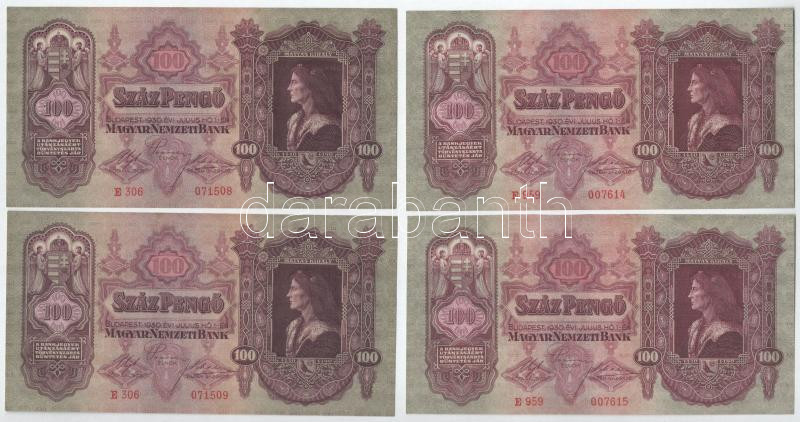https://www.darabanth.com/en/478-Online-auction/478.0/Numismatics/Hungarian-Banknotes~2000008/1930-100P-4x-parokent-sorszamkovetok-E-306-071508-E-306-071509-es-E-959-007614-E-959~II3231872