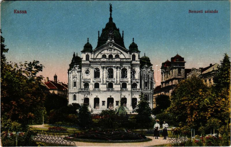 Kassa, Kosice; Nemzeti színház. Vasúti levelezőlapárusítás 34. sz. 191...