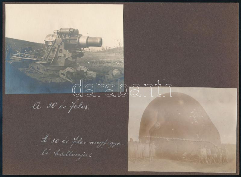 Description: cca 1914-1918 A 30 és feles (Škoda 30.5 cm Mörser M. 11 mozsár) és megfigyelő ballonja a fronton, 2 db I. világháborús fotó, feliratozott albumlapra ragasztva, 11x8,5 cm és 10x8 cm