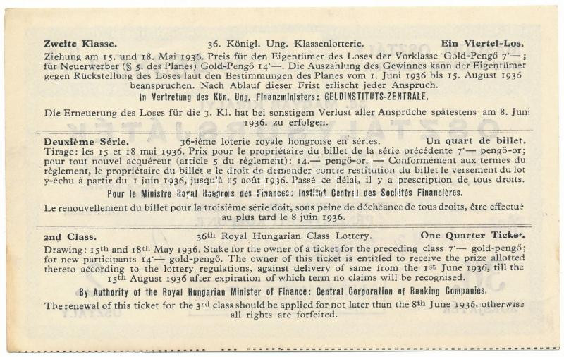 1936. "36. Magyar Királyi Osztálysorsjáték" második osztály 1/4 sorsje...