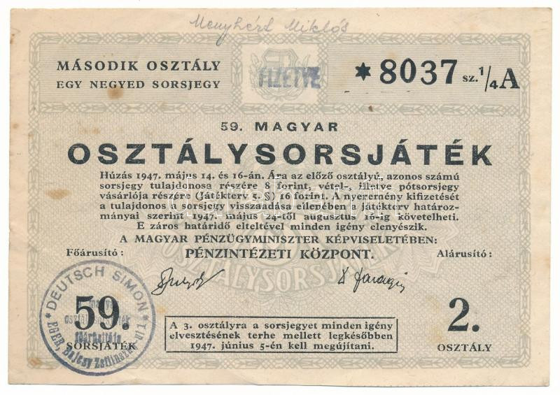 1947. "59. Magyar Osztálysorsjáték" második osztály 1/4 sorsjegye (A),...