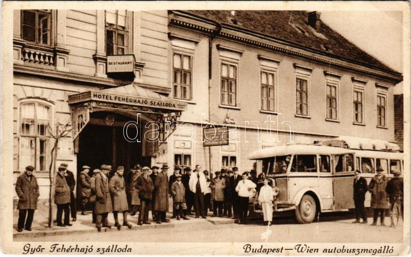 1932 Győr, Hotel Fehérhajó szálloda és étterem, Budapest-Wien autóbusz...