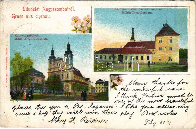 1904 Nagyszombat, Tyrnau, Trnava; Katonai rokkantház és templom, tébolyda (elmegyógyintézet) / K.u.K. military disability house and mental hospital, bedlam (asylum), church. floral + "ZSOLNA - POZSONY 48" vasúti mozgóposta bélyegző (EB)