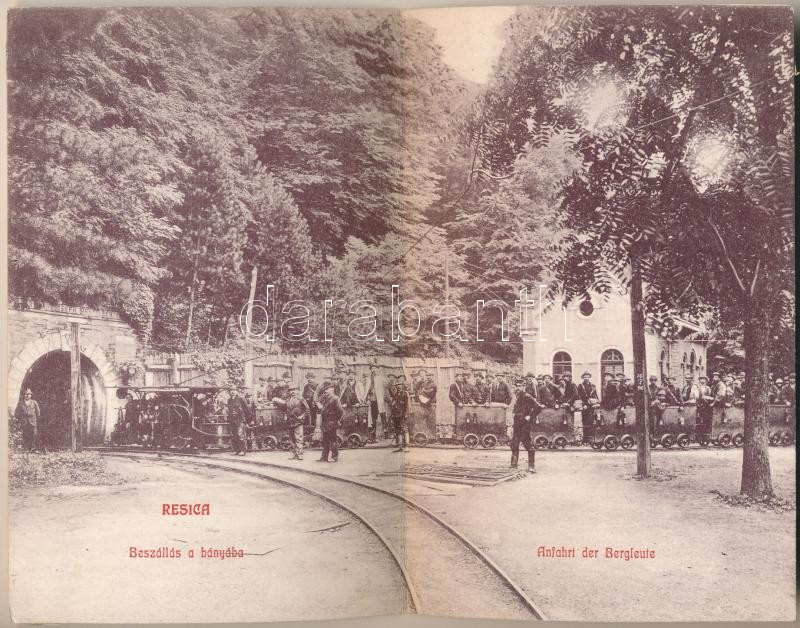 1909 Resica, Resicabánya, Resita; Beszállás a bányába, Ferenc József altáró, bányászok csillékben - 2-részes panorámalap / Anfahrt der Bergleute / mine entrance with miners in mine carts - 2-tiled folding panoramacard