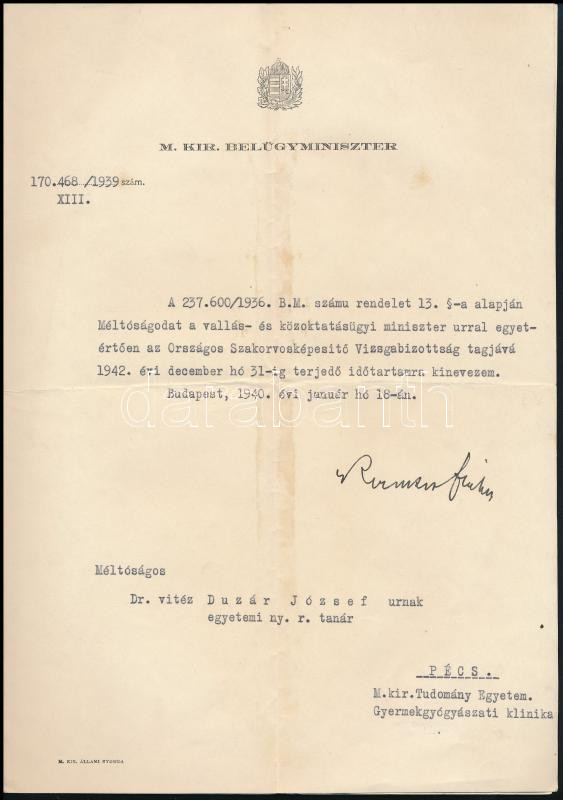 1940 Keresztes-Fischer Ferenc belügyminiszter által aláírt kinevezési ...