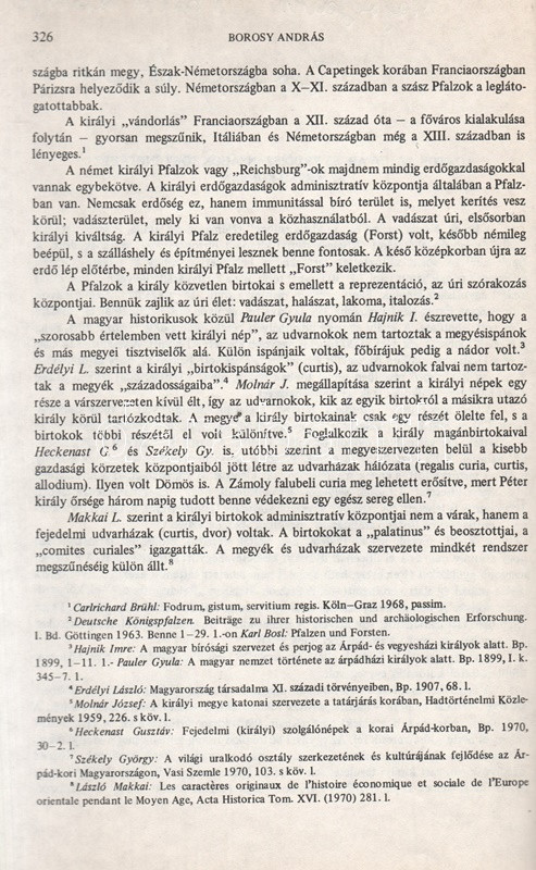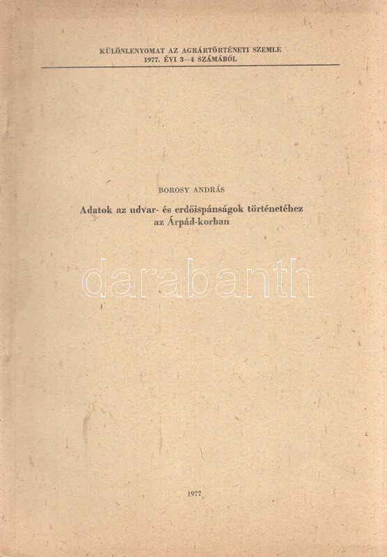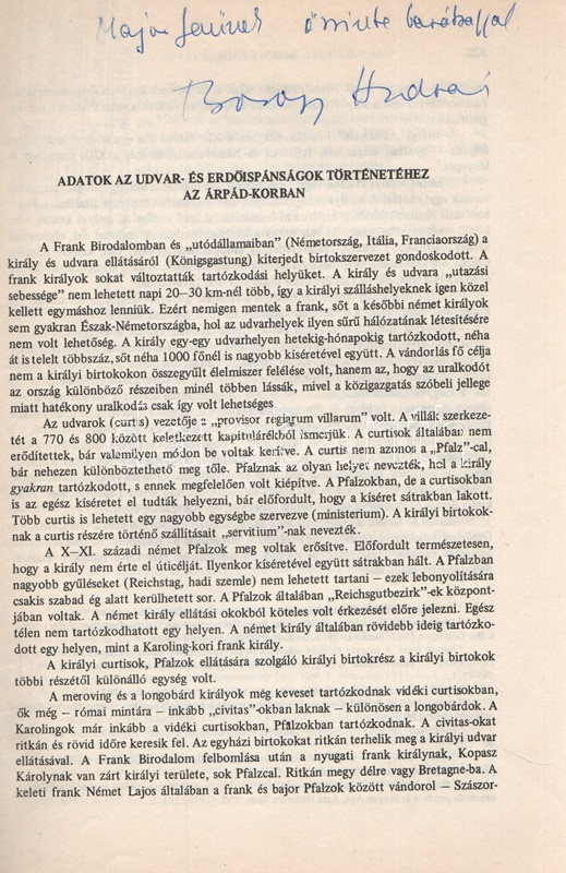 Dedikált: "Major Jenőnek őszinte barátsággal: Borosy András". Borosy András rövid dolgozata a középkori szóbeli közigazgatási és ítélkezési rendszer miatt állandóan úton levő királyi adminisztrációt kiszolgáló udvartartások és erdőbirtokok szervezeti sajátosságait tekinti át. A királyi adminisztráció (királyi udvar) folyamatos úton levése a korai középkortól a XII-XIII. századig Európa-szerte megszokott gyakorlatnak számított.