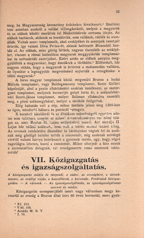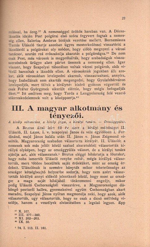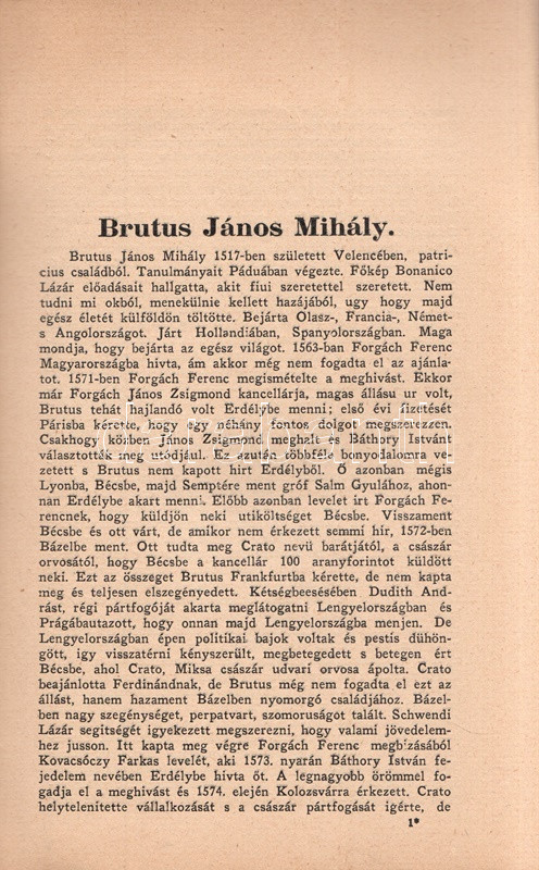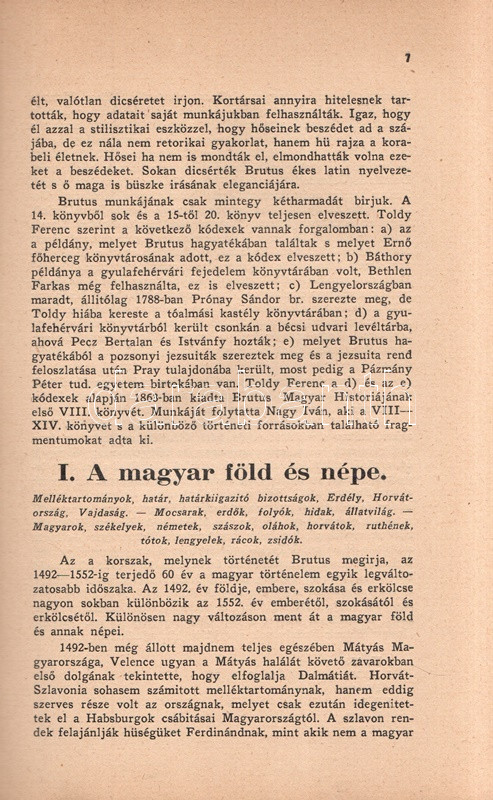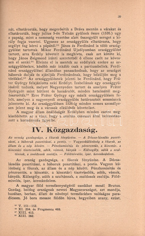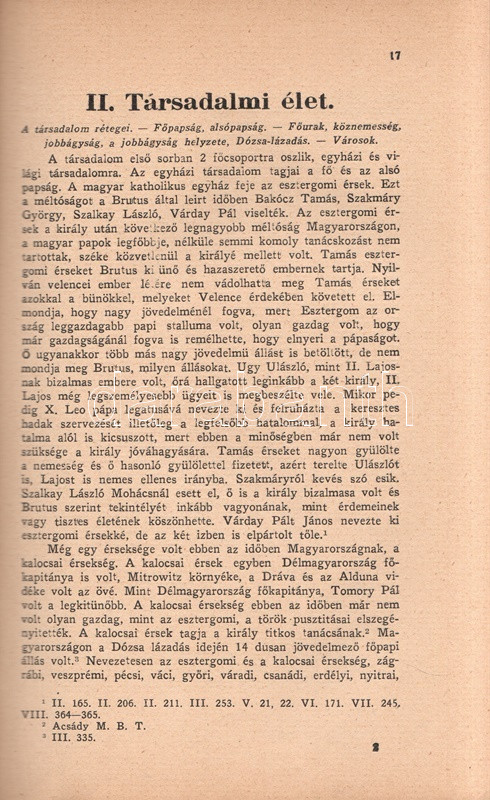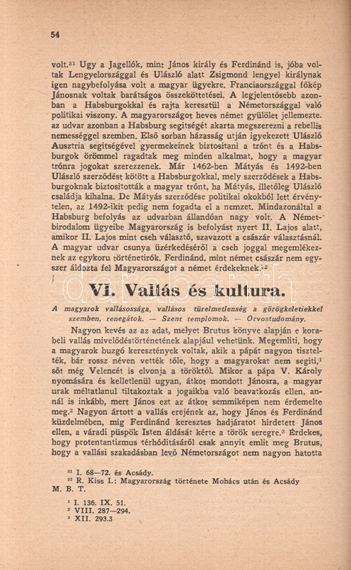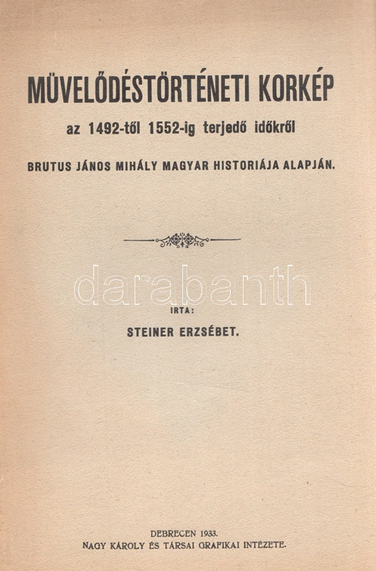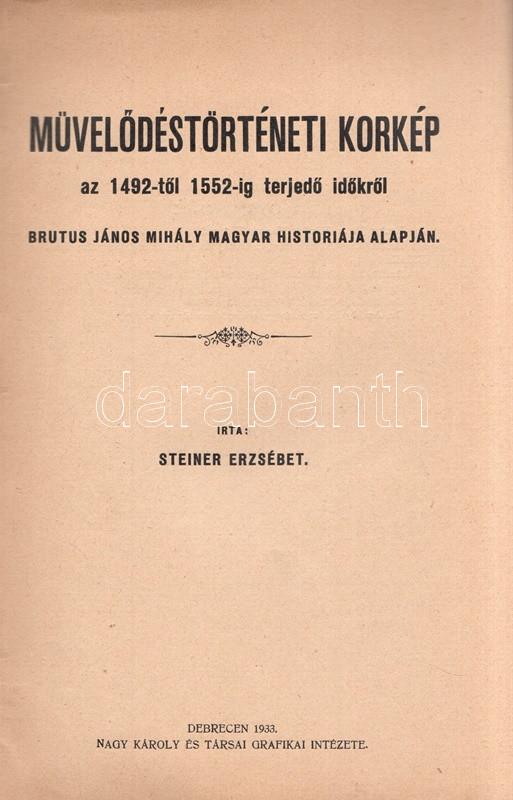 Steiner Erzsébet: MűvelÅ‘déstörténeti korkép az 1492-tÅ‘l 1552-ig terjedÅ‘ idÅ‘krÅ‘l Brutus János Mihály Magyar historiája alapján. Debrecen, 1933. Nagy Károly és Társai Grafikai Műintézete. 59 + [1] p. Egyetlen kiadás. Giovanni Michele Bruto (1517-1592) olasz származású humanista történetÃró, Báthory István erdélyi fejedelem és lengyel király szolgálatában készÃtette el latin nyelvű magyar történeti munkáját. A Bonfini történetÃrását mintaként használó történeti összegzés korabeli krónikák és levelezések alapján latinul Ãródott, és az 1490-1552 közötti idÅ‘szak történetét Ãrja meg, többek között azzal az igénnyel, hogy a Báthoryak uralkodását igazolja. A magyar történetelem felbolydult idÅ‘szakát megörökÃtÅ‘, némileg Habsburg-ellenes éllel Ãródott humanista krónika kézirata a mecénás, Báthory István 1585. évi halála miatt nem került nyomtatába, a munka csak évtizedekkel késÅ‘bb, Giovanni Michele Bruto más műveivel együtt került kiadásra, magyar fordÃtását pedig 1863-1867 között adta ki Toldy Ferenc, "Magyar história" cÃmen, ám a munka magyar fordÃtásának késedelmes kiadása nem kisebbÃti a munka művelÅ‘déstörténeti értékeit. Steiner Erzsébet a humanista történetÃrói munkából kibontakozó késÅ‘ középkori magyar társadalom közállapotait örökÃti meg. Fűzve, kiadói borÃtóban. Jó példány.