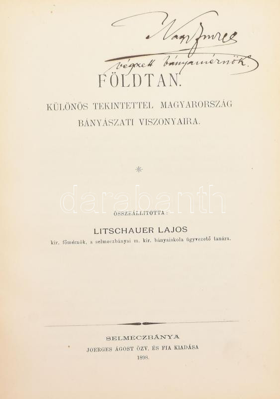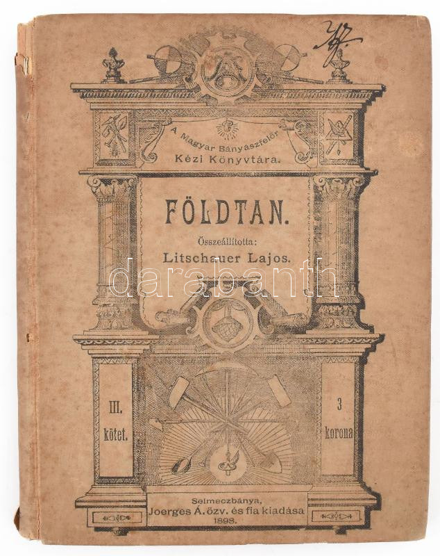 Litschauer Lajos: Földtan. Különös tekintettel Magyarország bányászati viszonyaira. Összeáll.: - -. A Magyar Bányász-Felőr Kézi Könyvtára III. köt. Selmecbánya, 1898, Joerges Ágost, IX+154+1 p.+1 (kihajtható táblával) t. Szövegközti képekkel illusztrált. Kiadói illusztrált egészvászon-kötés, kopott, foltos borítóval, sérült gerinccel, a címlapon bányamérnök tulajdonosi névbejegyzésével.