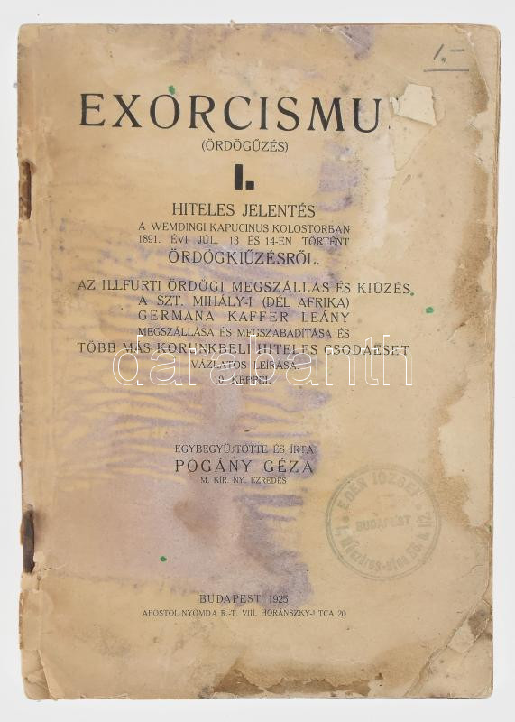 Hiteles jelentés a Wemdingi Kapucinus Kolostorban 1891. évi júl. 13 és 14-én történt ördögkiűzésről. Az illfurti ördögi megszállás és kiűzés. A Szt. Mihály-i (Dél Afrika) Germana Kaffer leány megszállása és megszabadítása és több más korunkbeli hiteles csodaeset vázlatos leírása. 10 képpel.
